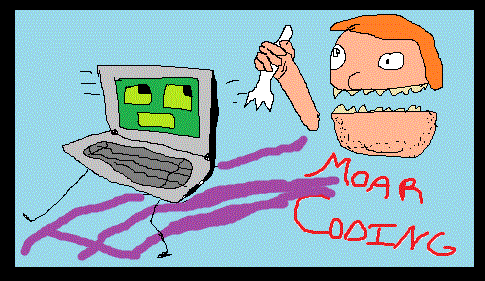 ![]() "I swear I've seen him feast upon helpless laptops to gain more codes like some sort of glutton. This man is an animal and defies logic." -Steve S. ![]() "That boy 'aint right I'll tell ya h'what. I think he's got some sort of Alien controlling his noggin." -drunk ramblings from Eric L. |